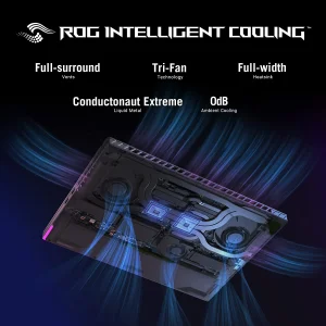 - ROG INTELLIGENT COOLING – To put this amount of power in a gaming laptop, you need an even better cooling solution. The Strix features Thermal Grizzly’s Conductonaut Extreme liquid metal on the CPU, and a third intake fan among other premium features, to allow for better sustained performance over long gaming sessions.