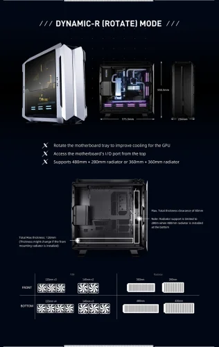 | Radiator Options | Dynamic: Front: 1 x 360/280/240mm Side: 1 x 360/280/240mm Dynamic-R (Rotate): Front: 1 x 360/280/240mm Base: 1 x 480/420/360/280/240mm Performance: Front: 1 x 480/420/360/280/240mm Top: 1 x 360/280/240mm |